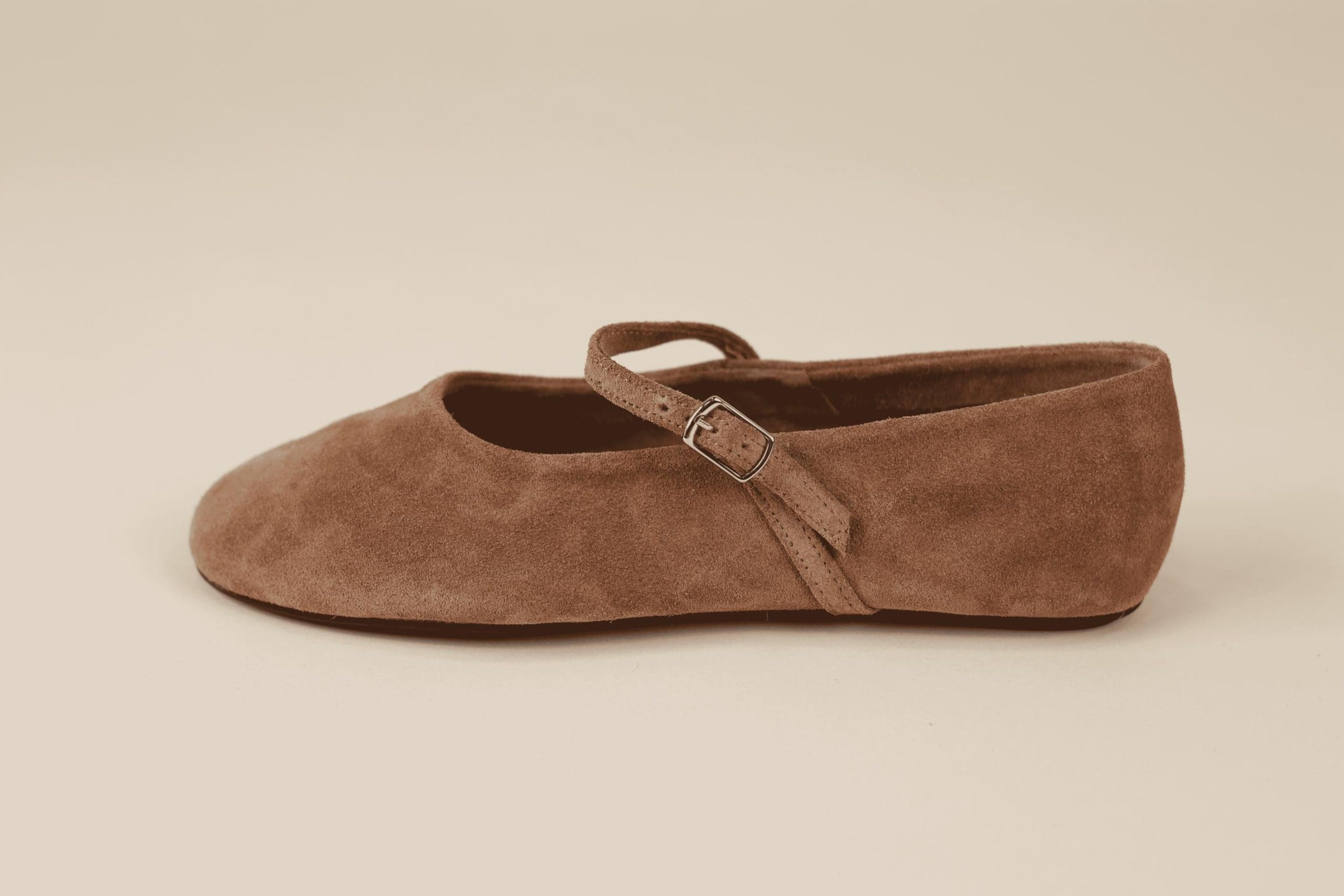 Ballerine femme en daim beige. Bout rond. Bride fine avec boucle métallique. Semelle plate. Intérieur doublé tissu. Modèle bas, sans talon
