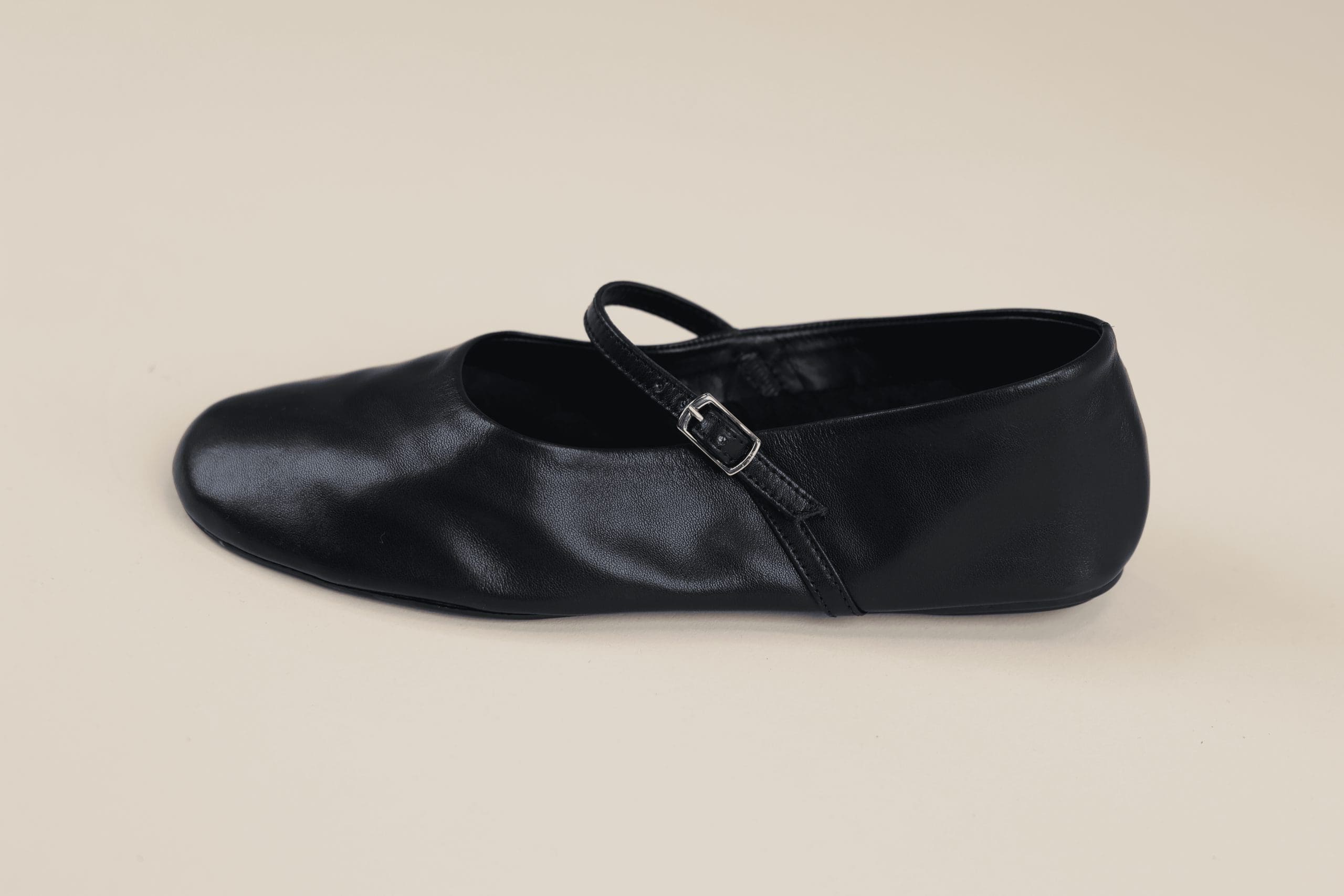 Ballerine femme en cuir noir. Bout rond. Bride fine avec boucle métallique. Semelle plate. Intérieur doublé tissu. Modèle bas, sans talon
